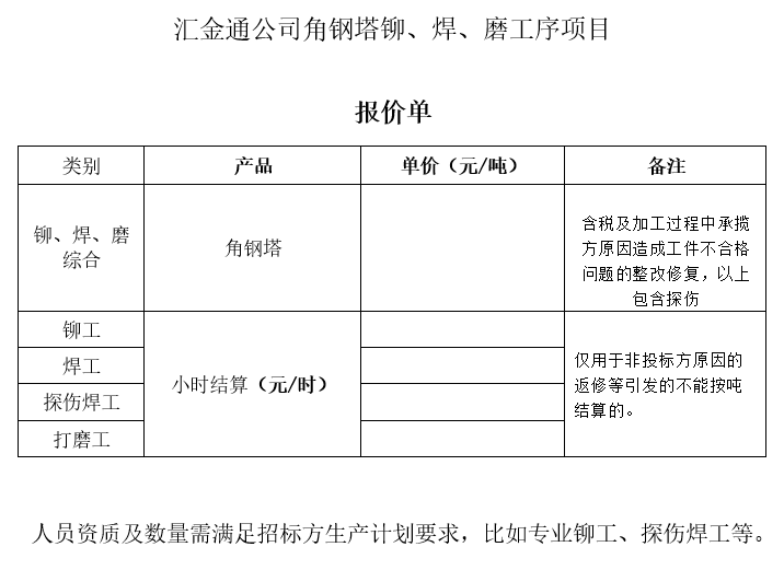 汇金通公司角钢塔铆焊磨工序项目公开招标公告